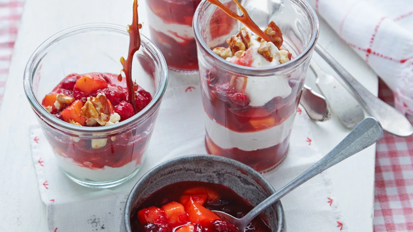 Für besondere Anlässe eignet sich eine Mascarpone-Creme mit Cranberrys und Mango im Glas. Die cremige Mascarpone wird mit Kardamom, Nelken und Zimt verfeinert und schichtweise mit einem Cranberry-Kompott und gewürfelter Mango in Gläser gefüllt. Als Krönung kommt ein selbstgemachtes Walnuss-Karamell obendrauf. Dieses Dessert lässt sich wunderbar vorbereiten und begeistert optisch sowie geschmacklich.
