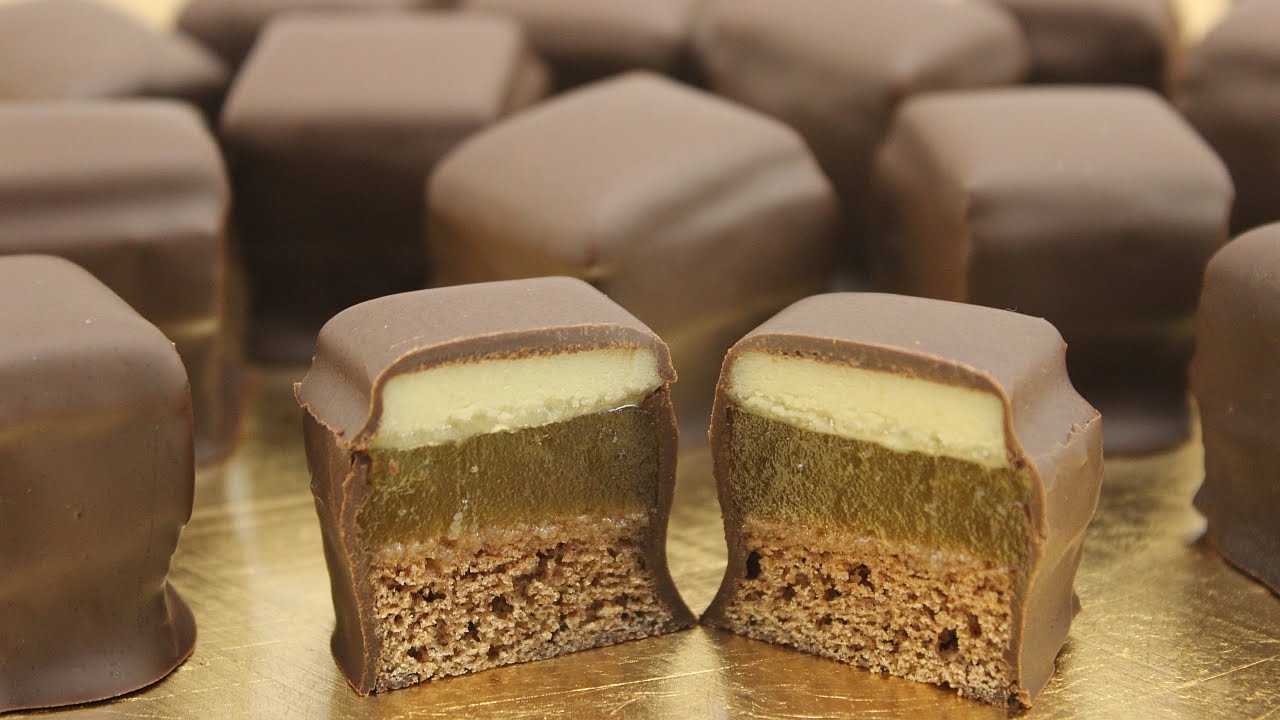 Schritt 5: Schneiden und überziehen Schneiden Sie die Platte mit einem scharfen Messer in gleichmäßige Würfel von etwa 2,5 x 2,5 cm. Tauchen Sie das Messer nach jedem Schnitt in heißes Wasser – so gleitet es besser durch die Schichten.