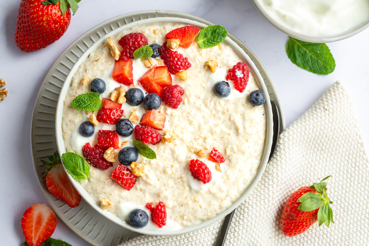 Beeren-Porridge: Toppe dein fertiges Porridge mit frischen oder gefrorenen Beeren wie Heidelbeeren, Himbeeren oder Erdbeeren. Ein Klecks Joghurt rundet das Ganze perfekt ab.