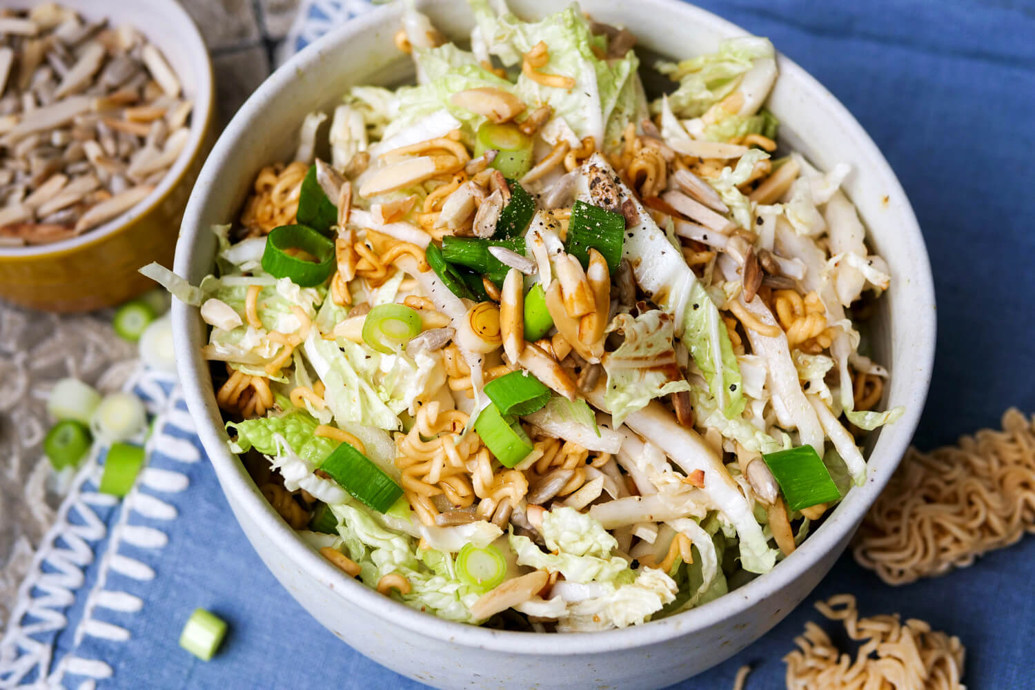 Mie-Nudeln und klassische Instant Ramen funktionieren am besten. Kochen Sie sie etwas kürzer als angegeben, schrecken Sie sie ab und braten Sie sie dann knusprig an.