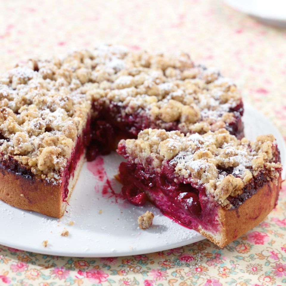 Die Streusel bestehen aus 300 g Mehl, 200 g kalter Butter und 150 g Zucker – einfach mit den Händen zu Streuseln verkneten. Als besondere Verfeinerung kann eine dünne Schicht geriebenes Marzipan zwischen Teigboden und Kirschen verteilt werden. Das gibt dem Kuchen eine herrlich nussige Note und verhindert, dass der Boden durchweicht.