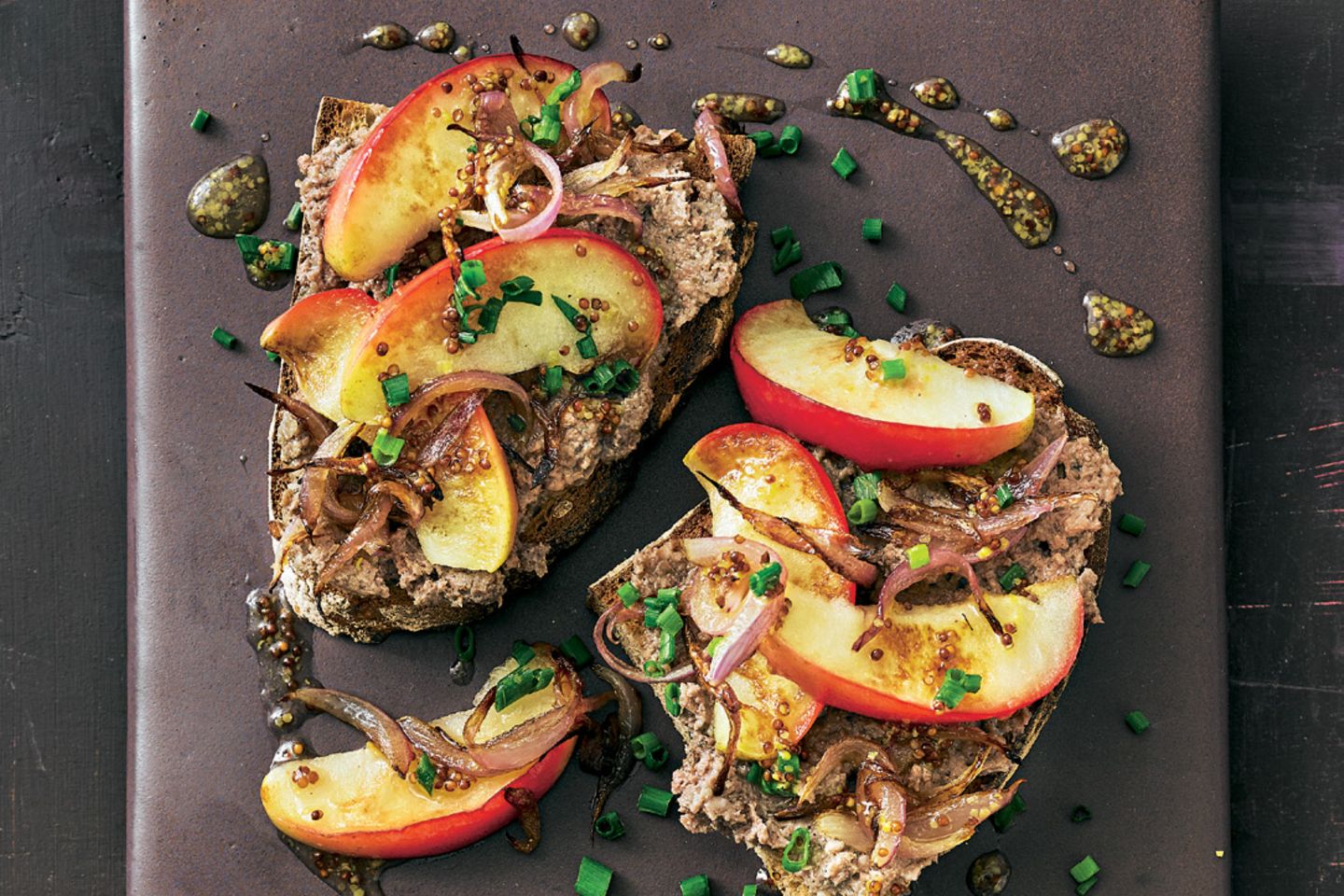 Apfel-Leberwurst-Toast aus dem Ofen: Rösten Sie Toastscheiben leicht an, bestreichen Sie sie dick mit Leberwurst und belegen Sie sie mit etwa 1 cm dicken Apfelscheiben (ohne Kerngehäuse). Beträufeln Sie die Äpfel mit etwas Zitronensaft und überbacken Sie alles bei 220°C für etwa 8 Minuten. Die Kombination aus warmer Leberwurst und leicht karamellisierten Äpfeln ist unwiderstehlich.