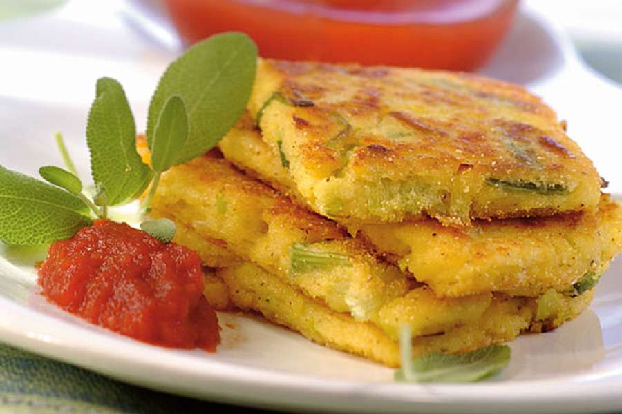 - Schneiden Sie die feste Polenta in Rechtecke oder Dreiecke.