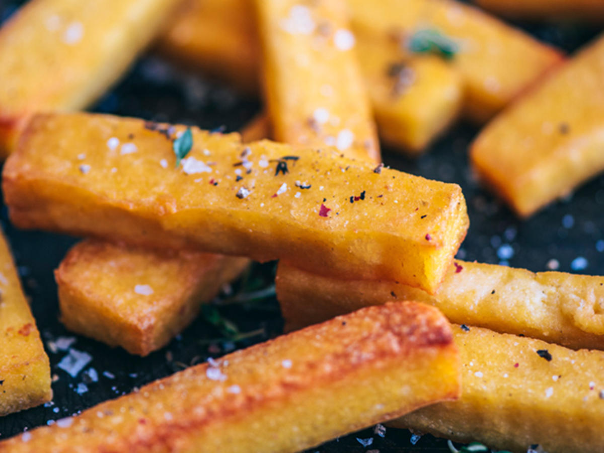 Schneide feste Polenta in fingerdicke Streifen – wie Pommes. Brate sie in heißem Öl goldbraun und knusprig oder backe sie im Ofen bei 220°C etwa 25-30 Minuten, dabei einmal wenden. Würze sie mit Salz, Pfeffer und getrocknetem Rosmarin. Serviere die Polenta-Pommes mit einem cremigen Dip aus Joghurt, gehackten Kräutern, Knoblauch und Zitronensaft. Eine gesündere und glutenfreie Alternative zu normalen Pommes!