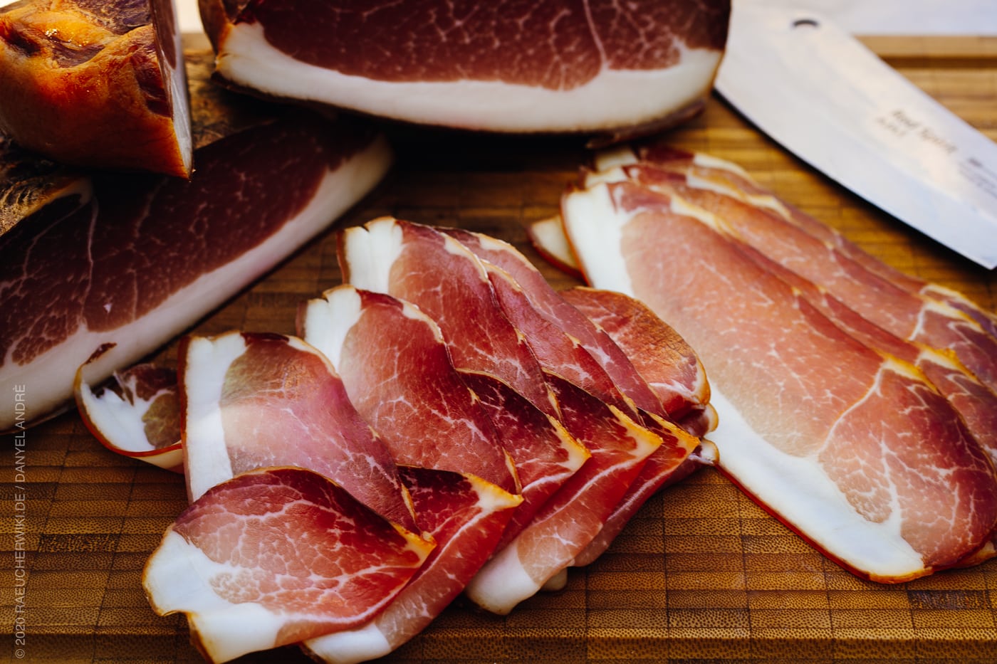 Schwarzwälder Schinken g.g.A. (geschützte geografische Angabe) ist eine der bekanntesten Delikatessen Deutschlands. Das charakteristische Merkmal dieses Rohschinkens ist seine kastanienbraune Außenhaut und das leuchtend rote Fleisch im Inneren. Die Herstellung ist ein aufwendiger Prozess, der mehrere Monate dauert: Die Schweinekeule wird zunächst mit einer speziellen Gewürzmischung aus Salz, Pfeffer, Koriander, Knoblauch und vor allem Wacholderbeeren trockengepökelt. Anschließend folgt die Kalträucherung über heimischem Nadelholz, wodurch der Schinken seine typische Rauchnote erhält.