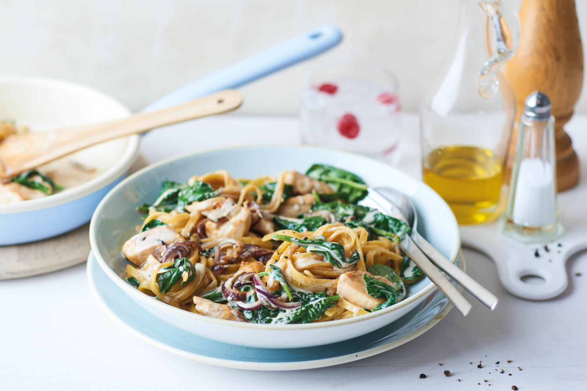 Junger Blattspinat welkt in der heißen Pfanne innerhalb weniger Sekunden zusammen. Vermischen Sie ihn mit cremigem Ricotta, etwas Muskatnuss und Parmesan zu einer würzigen Füllung. Diese Kombination kennen Sie vielleicht von Ravioli – aber auch als Sauce zu Tagliatelle ist sie fantastisch.